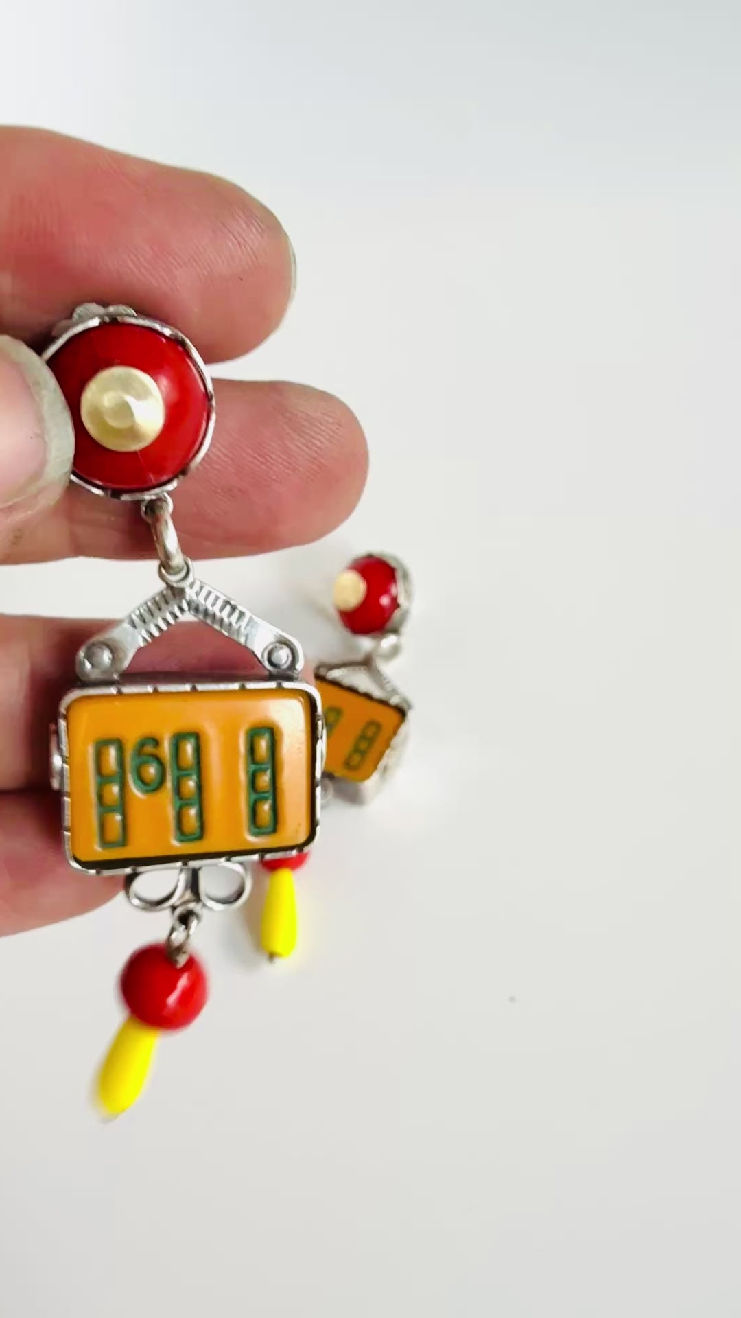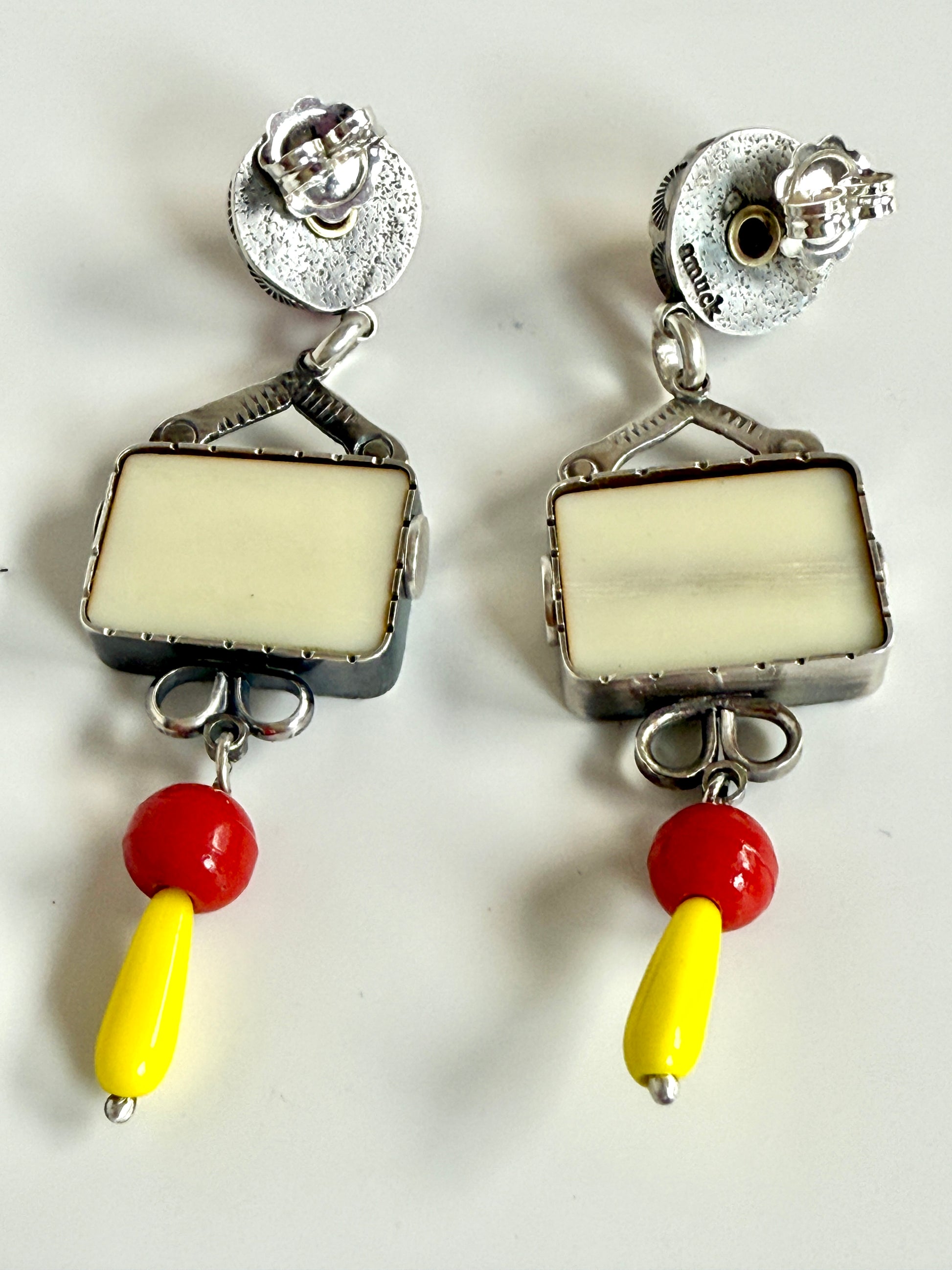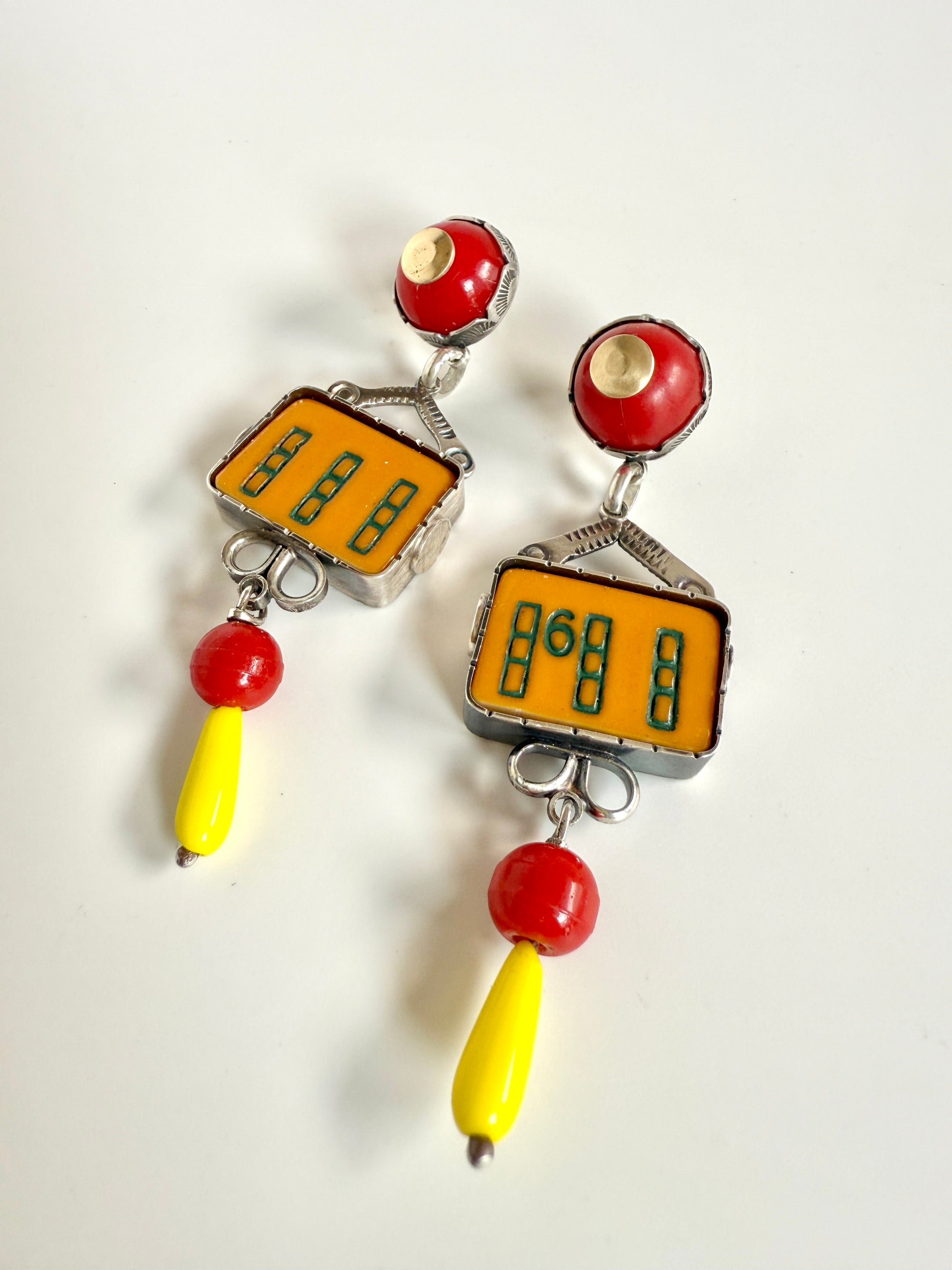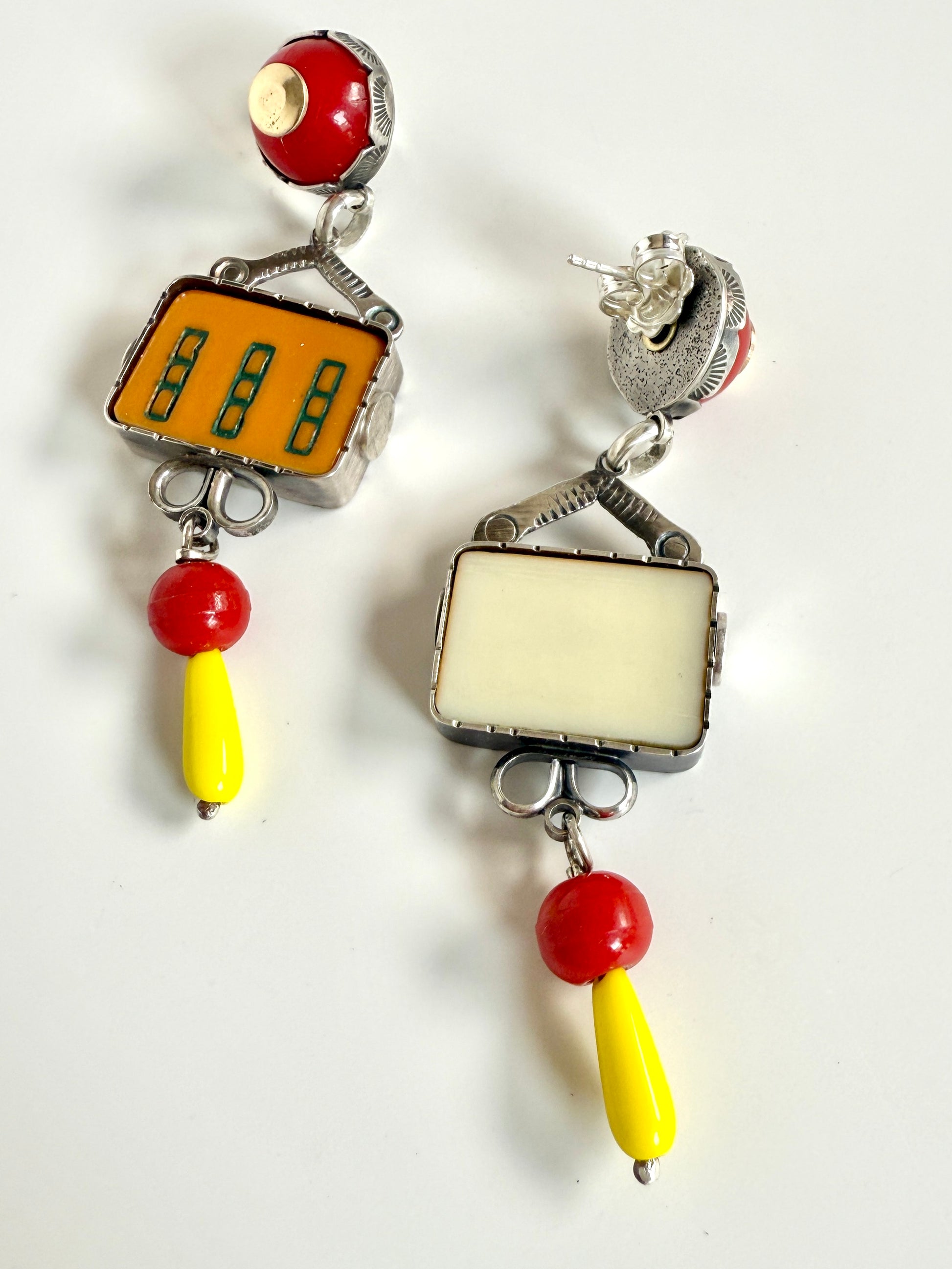 This pair of earrings has some serious pop! I've cut a mahjong tile to create the body of these fun dangles. A vintage red plastic bead has been cut in half to create the "stones" for the ear posts. Glass beads, sterling and brass bring it all together.