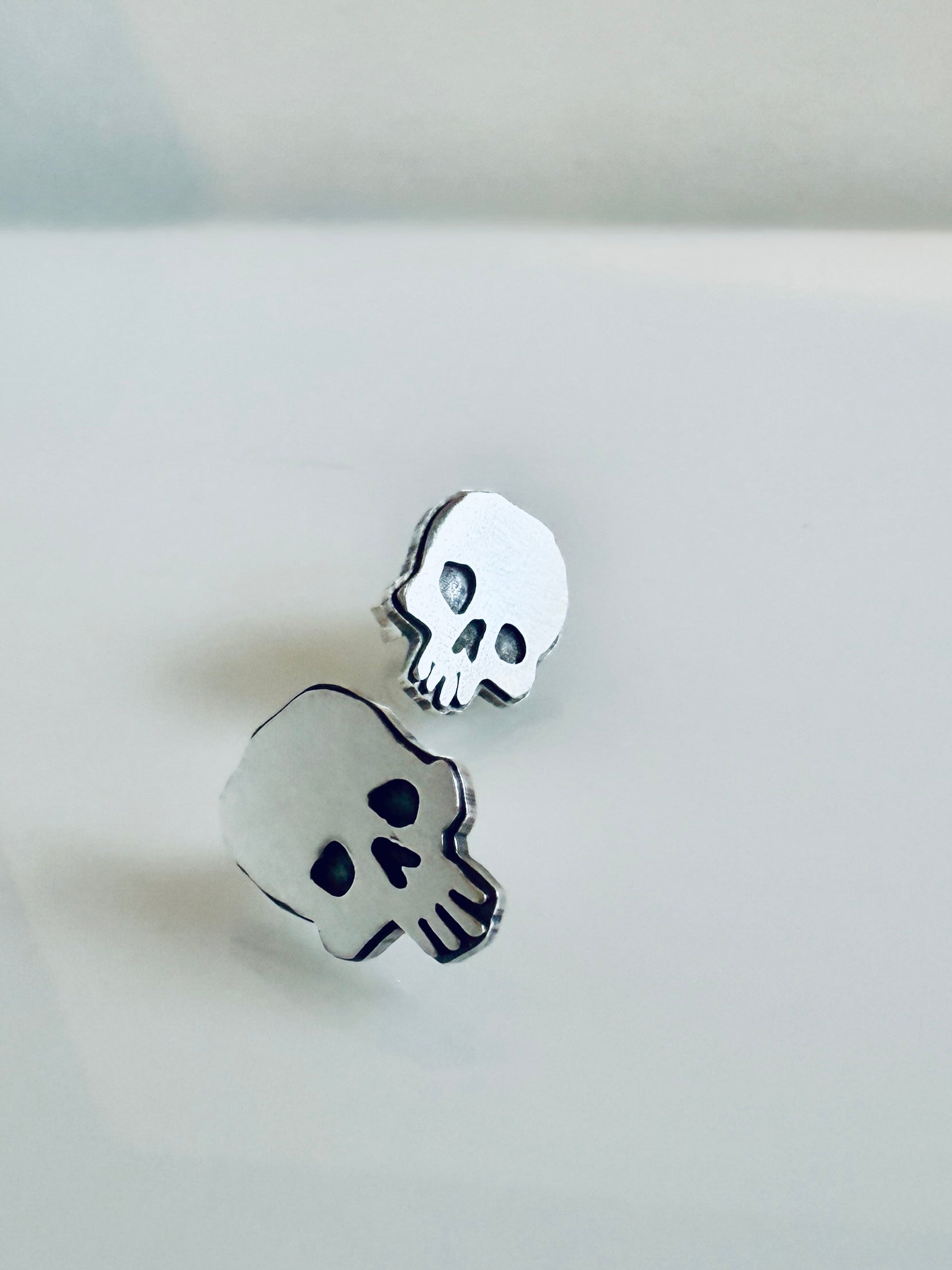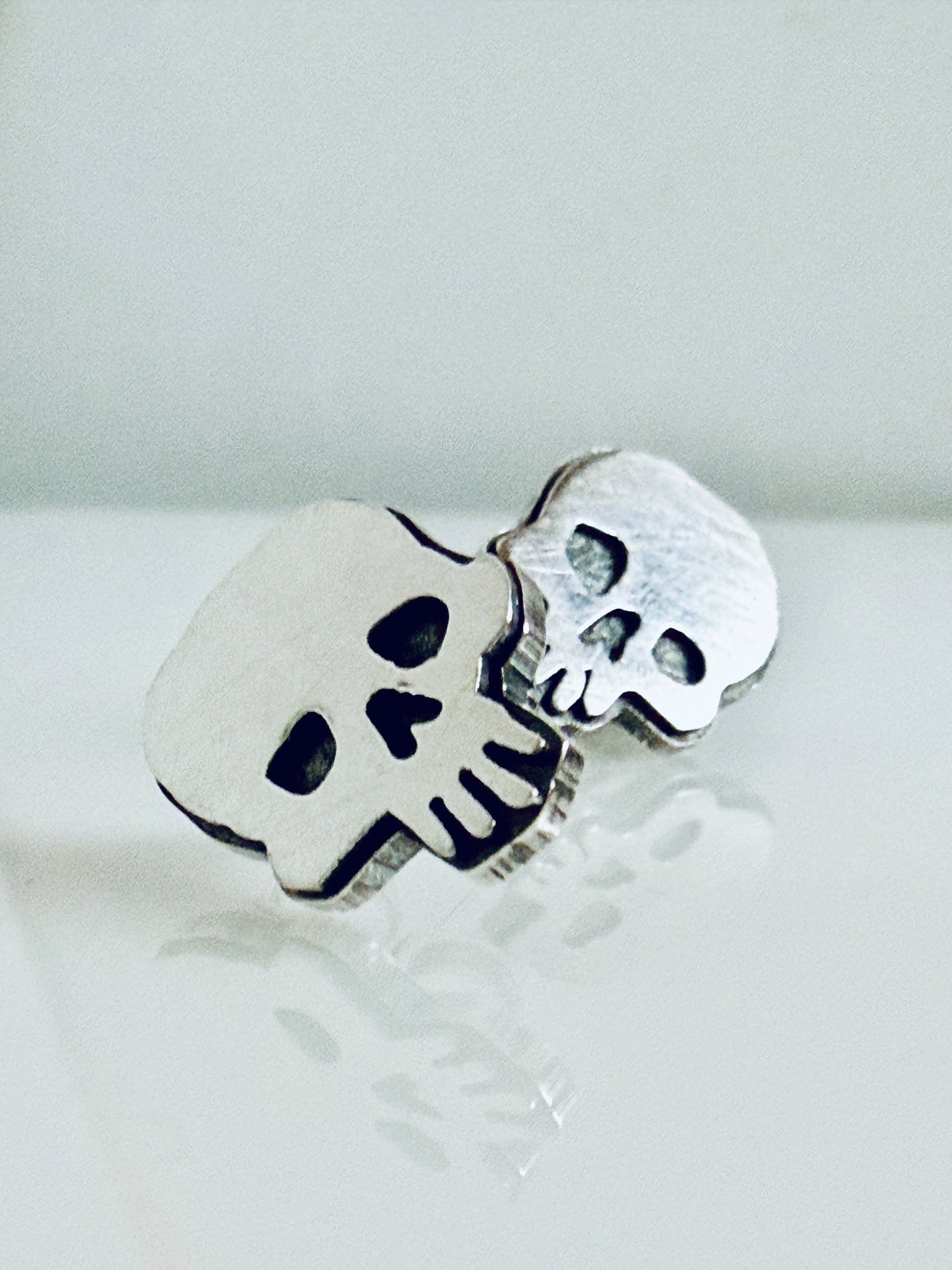 Sterling and finer silver layered to create a spooky skull. Each skull is hand cut so will have its own unique character. These measure just under 3/4” tall.