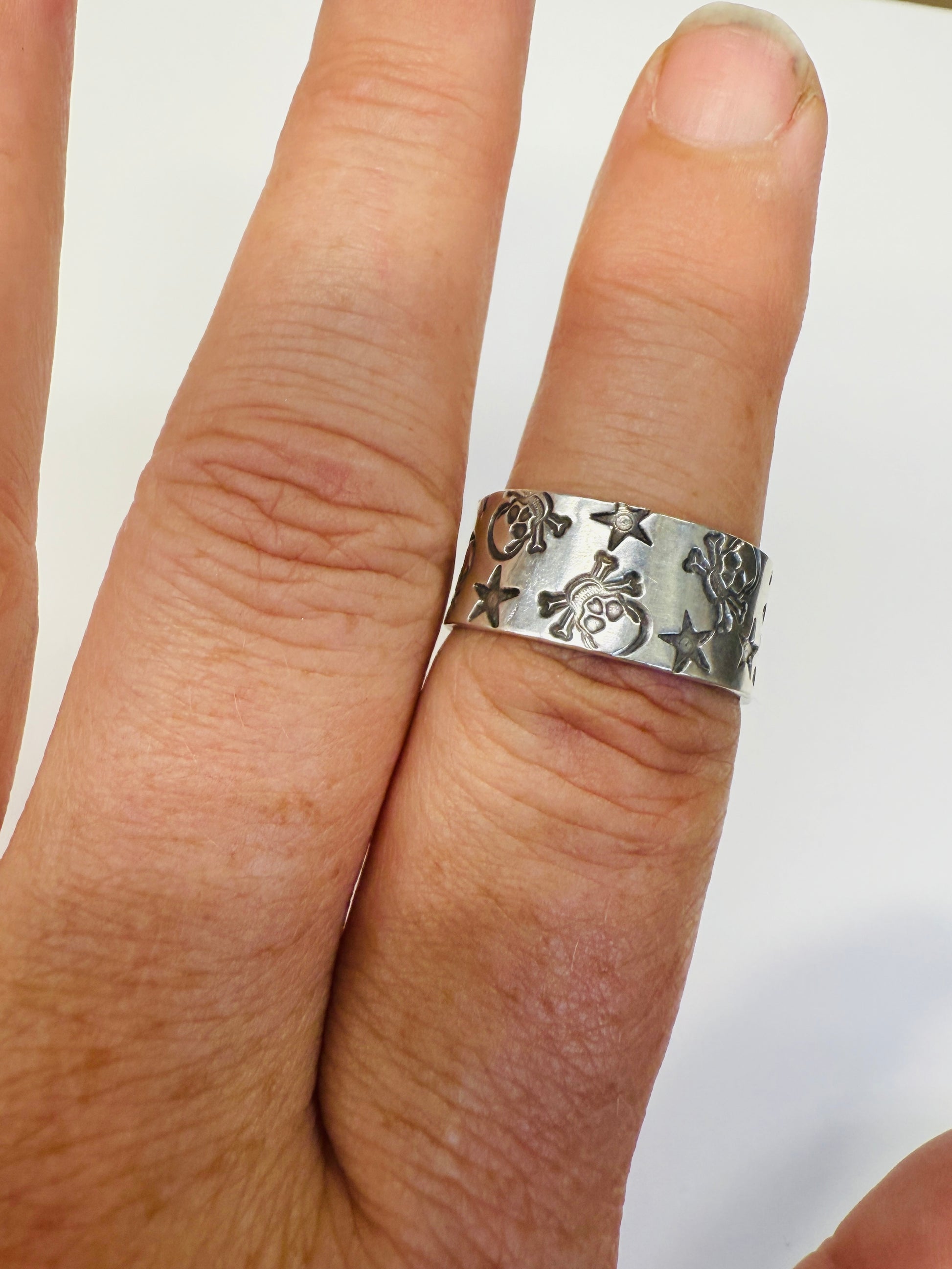A cool sterling band stamped with stars and skulls. Super for an everyday wear.